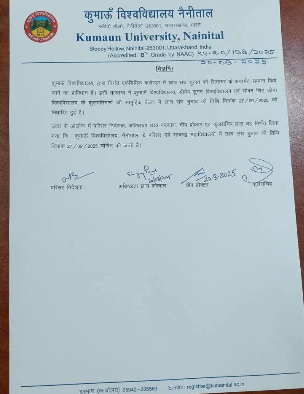 नैनीताल – कुमाऊँ विश्वविद्यालय में छात्र राजनीति का लंबे समय से चला आ रहा इंतज़ार अब समाप्त हो गया है। विश्वविद्यालय प्रशासन ने आधिकारिक रूप से घोषणा करते हुए साफ कर दिया है कि छात्र संघ चुनाव आगामी 27 सितम्बर 2025 को कराए जाएंगे।