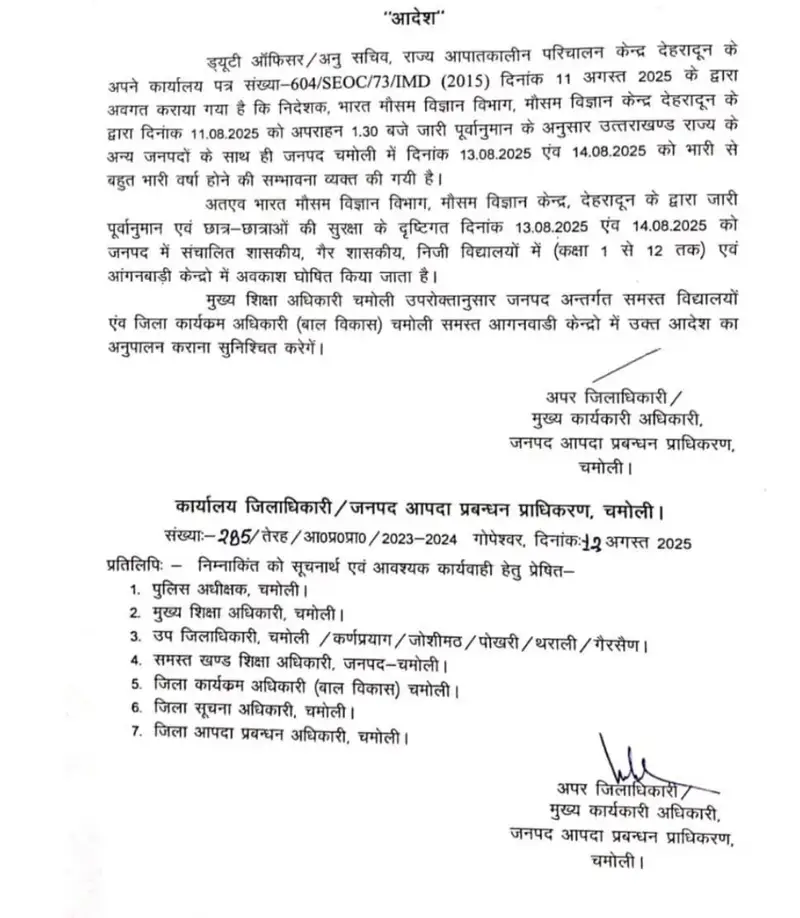 उत्तराखंड में लगातार हो रही मूसलाधार बारिश और मौसम विभाग की चेतावनी को देखते हुए प्रशासन ने सतर्कता बरतते हुए महत्वपूर्ण कदम उठाए हैं। भारत मौसम विज्ञान विभाग ने 13 और 14 अगस्त 2025 को चमोली जनपद में भारी से बहुत भारी वर्षा की चेतावनी जारी की है।
